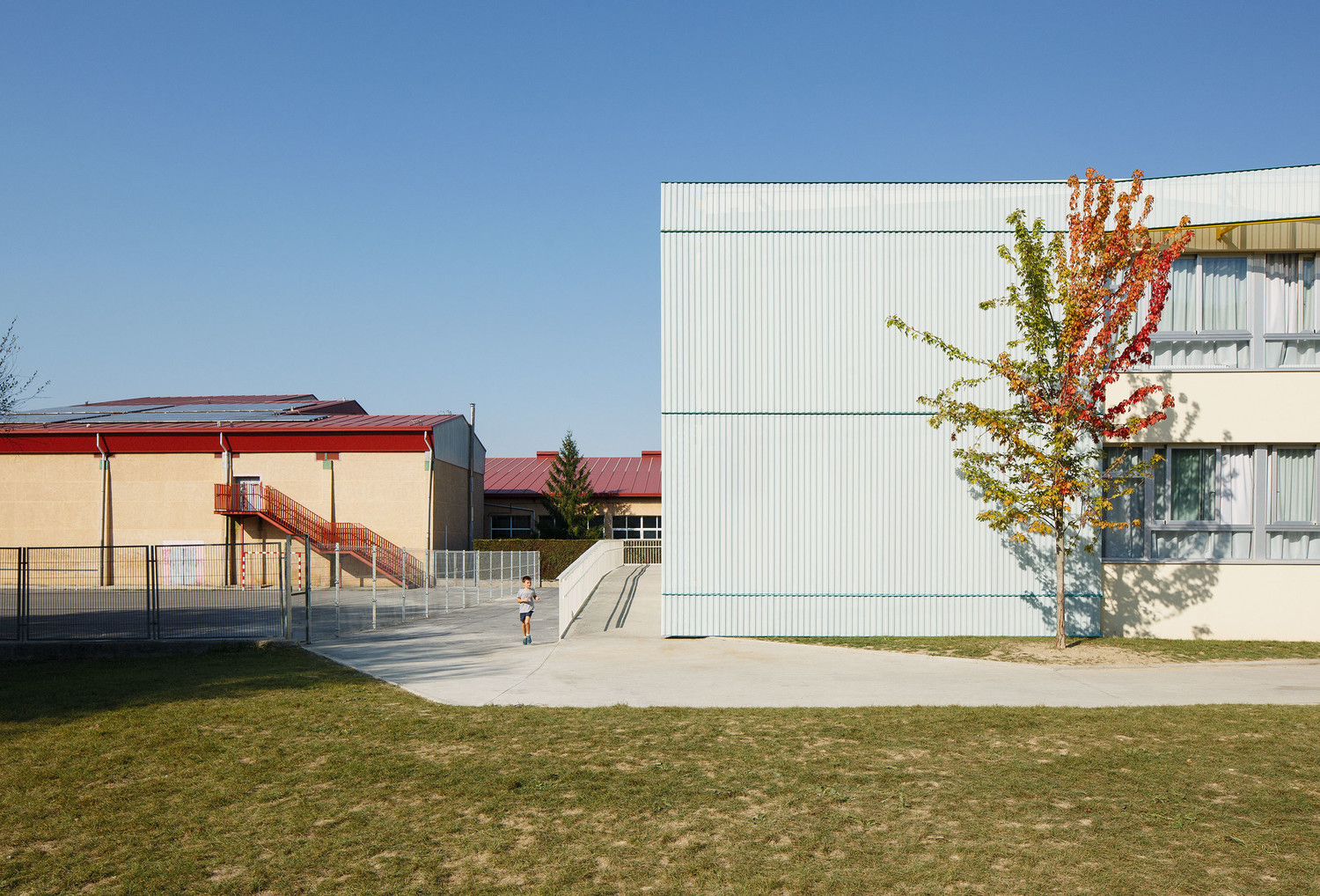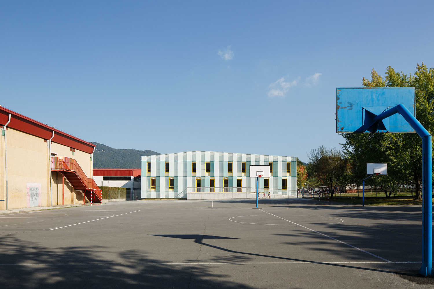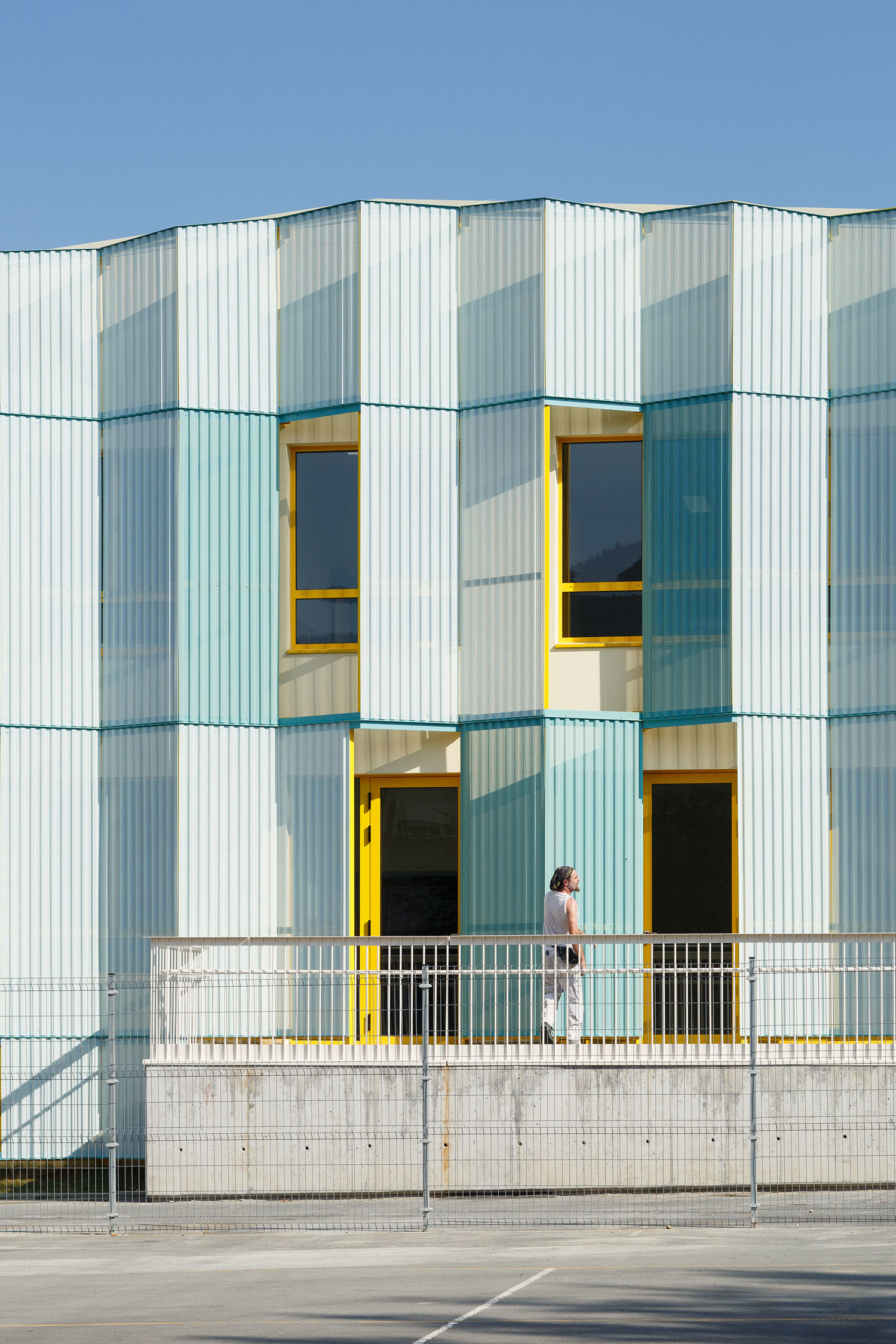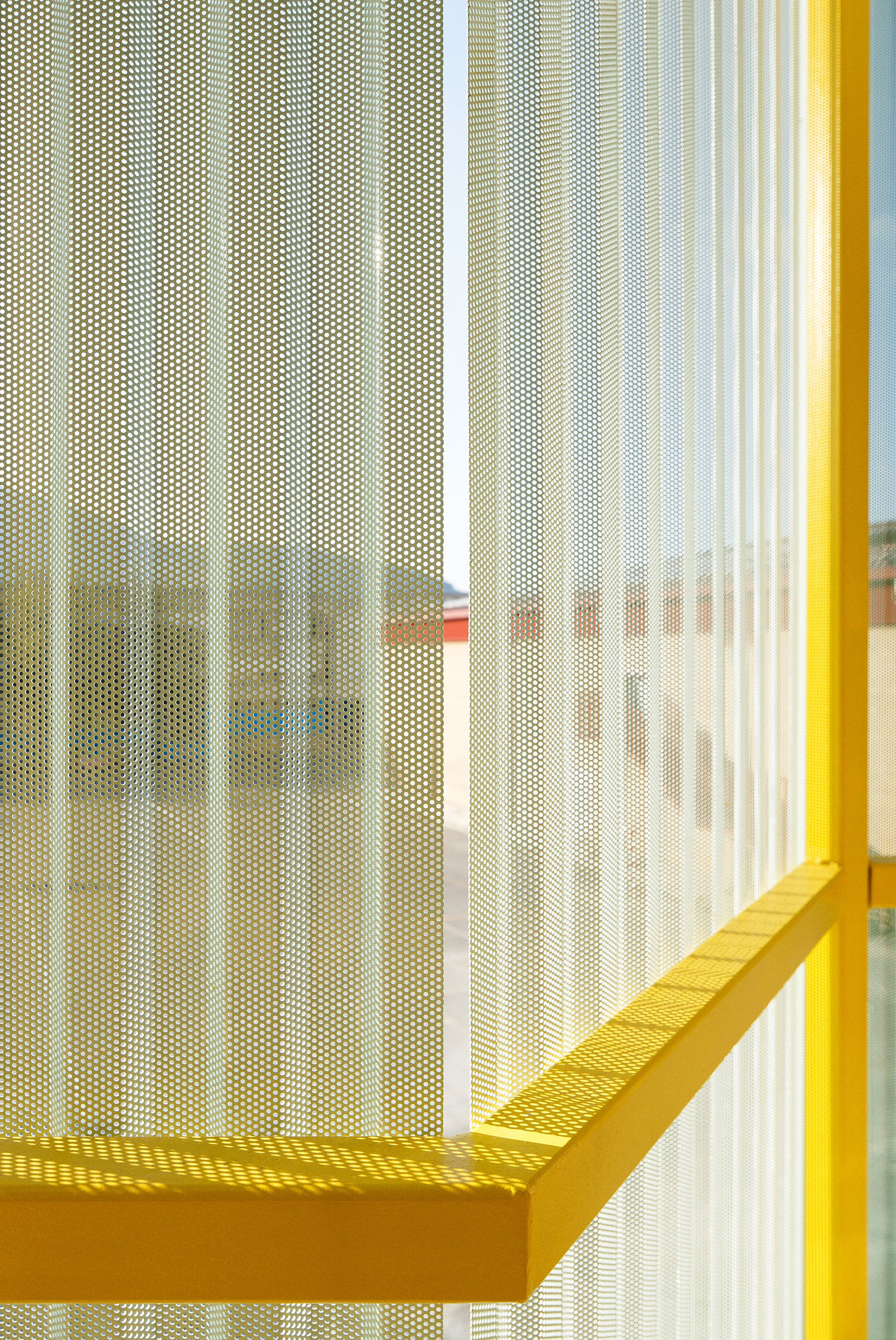 The extension follows the compositional pattern of the existing building on the north and south facades. On themainfacade, facing the playground,a pleated micro-perforated shutter is projected as a latticework. This lattice ensures an effective solar control for this west orientation and at the same time it offers sufficient mechanical guarantees to facethe sports tracks. The constructive development of this element takes into account in addition to its mechanical strength, its geometric composition for a no scalable playground front.