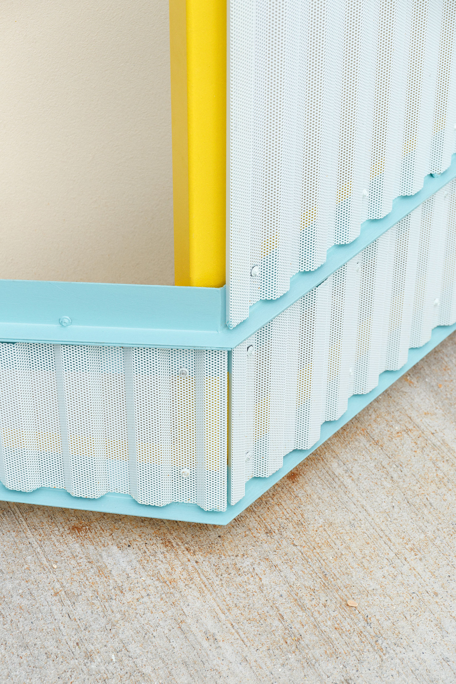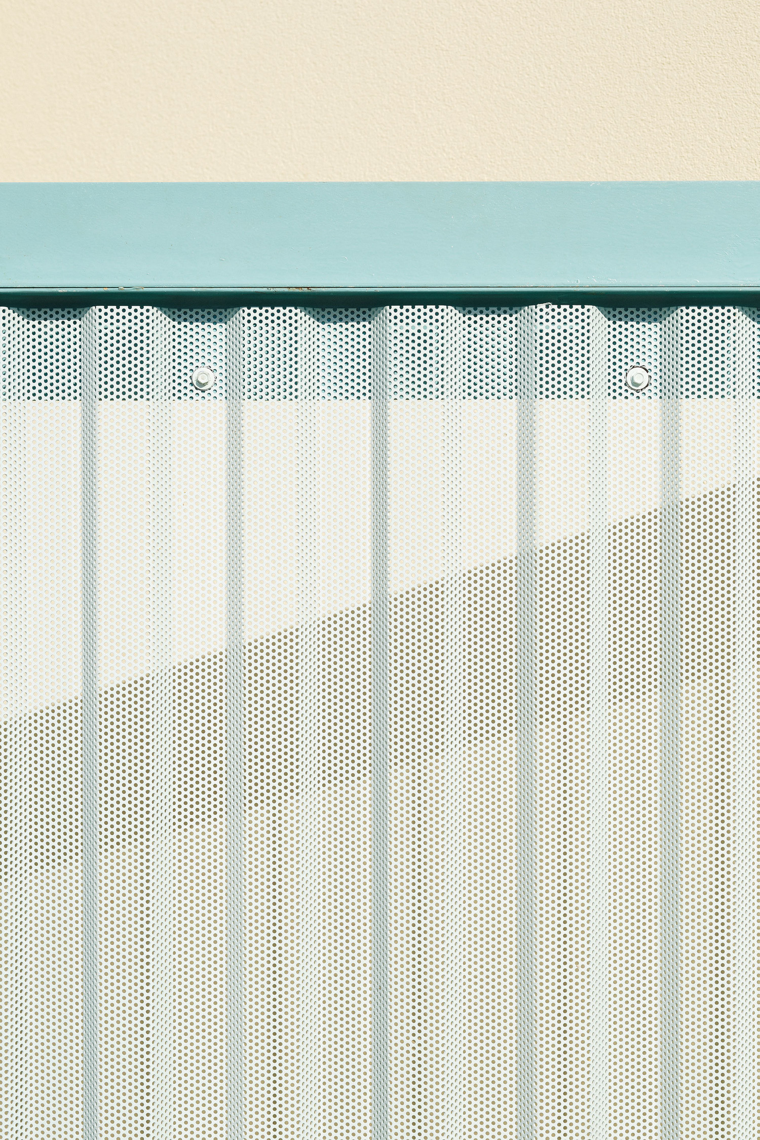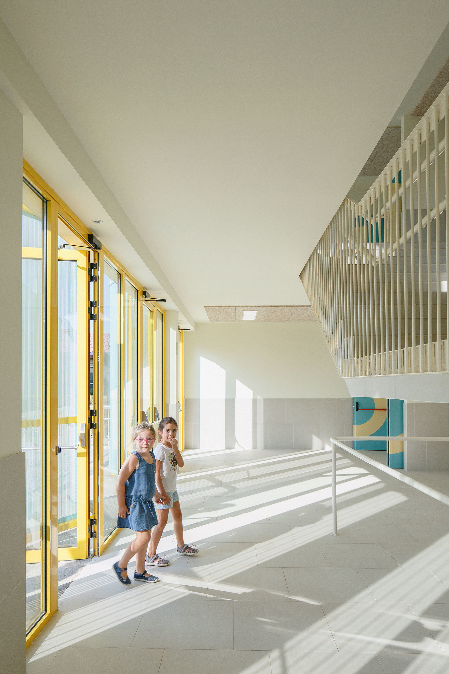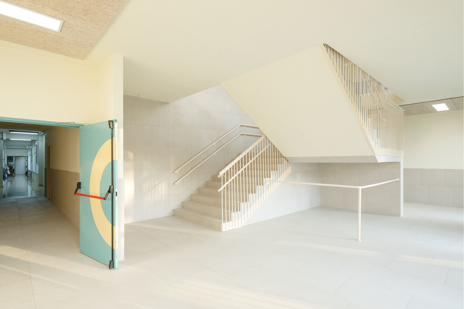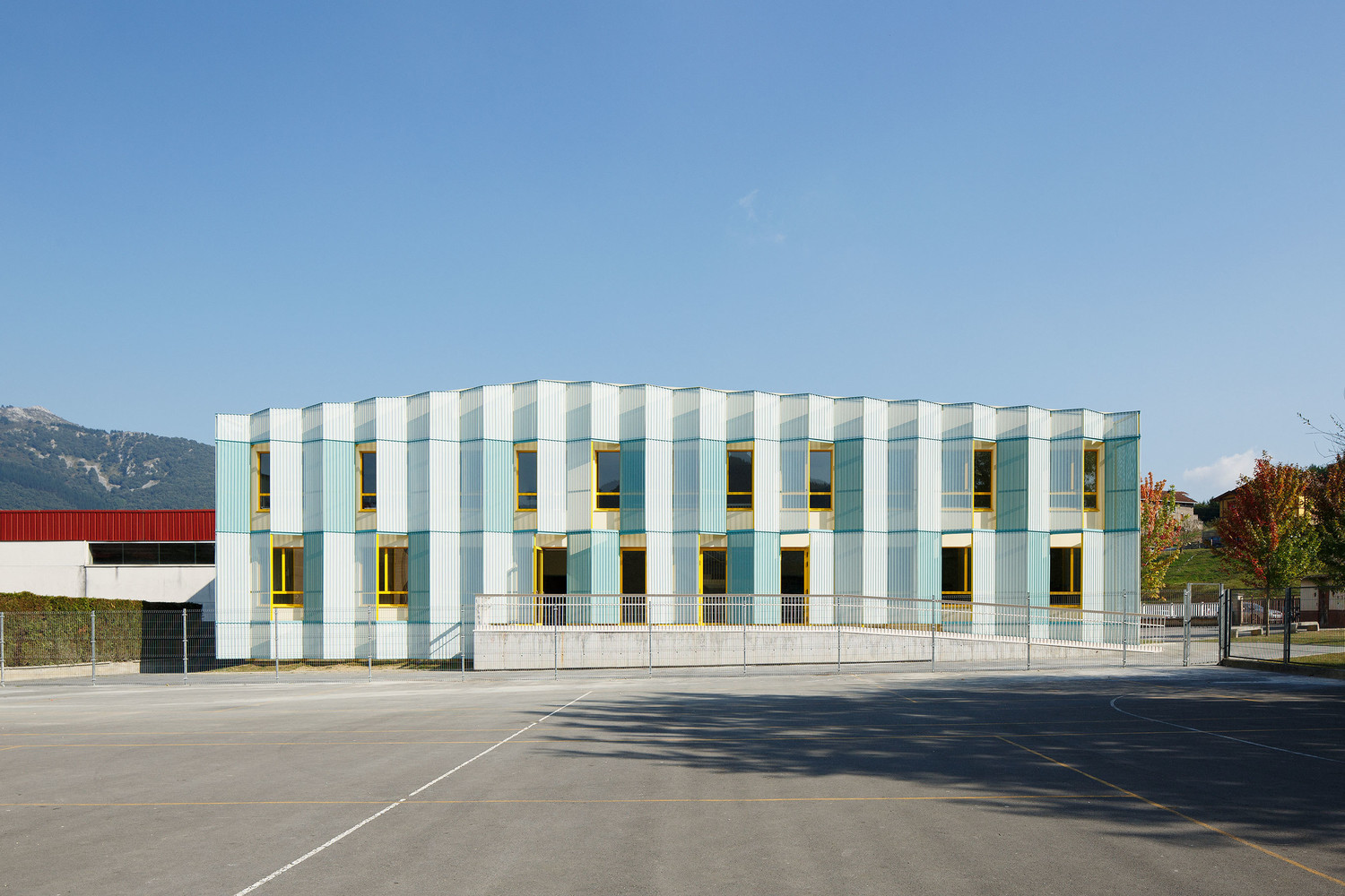 The extension follows the compositional pattern of the existing building on the north and south facades. On themainfacade, facing the playground,a pleated micro-perforated shutter is projected as a latticework. This lattice ensures an effective solar control for this west orientation and at the same time it offers sufficient mechanical guarantees to facethe sports tracks. The constructive development of this element takes into account in addition to its mechanical strength, its geometric composition for a no scalable playground front.