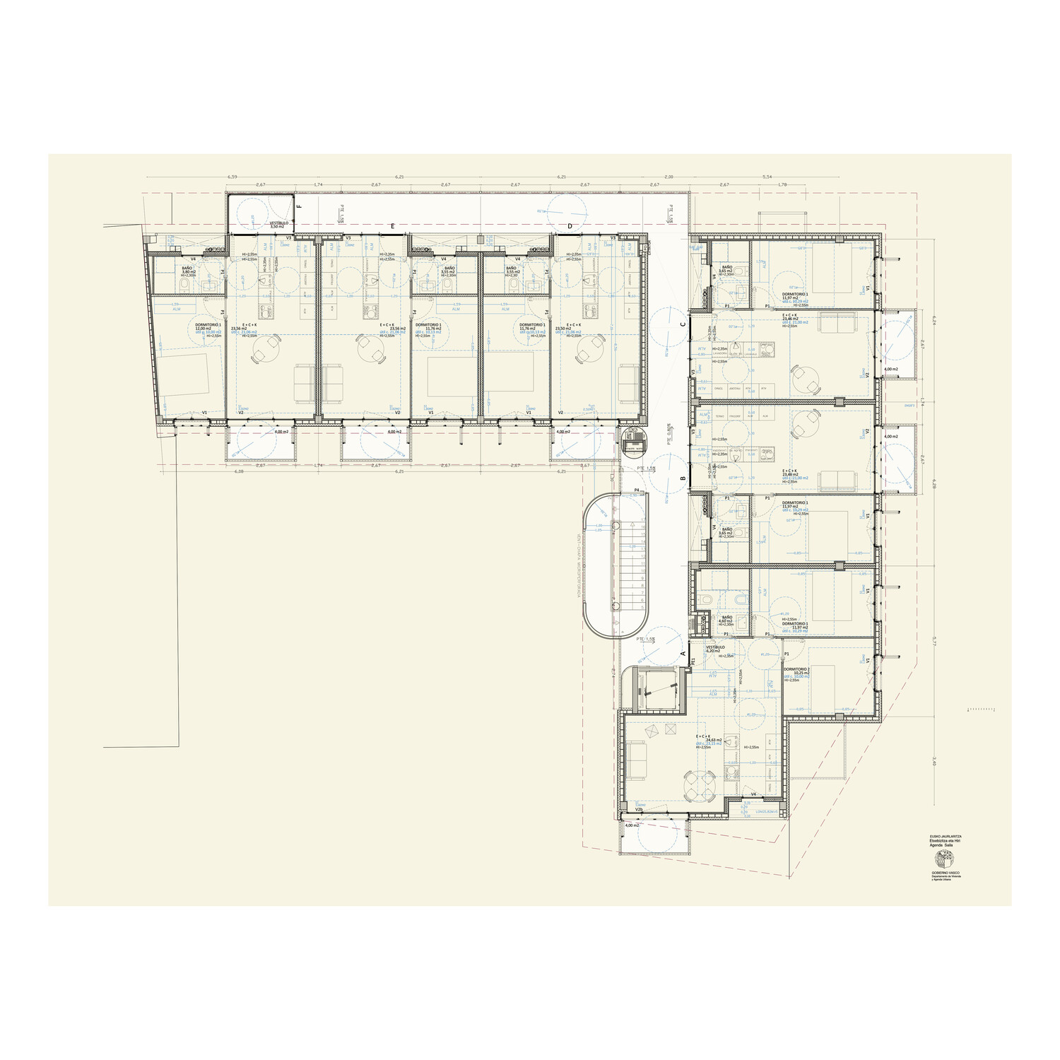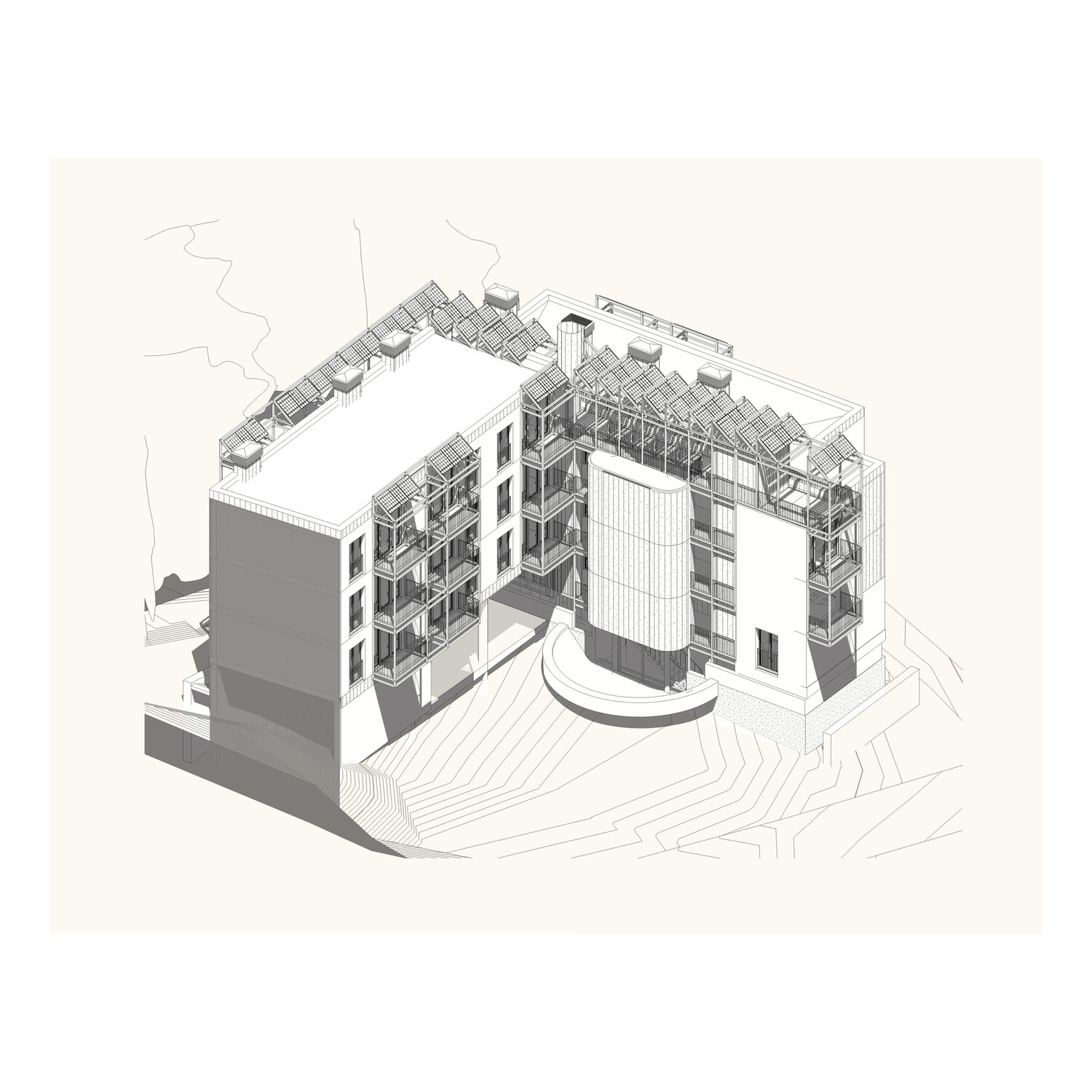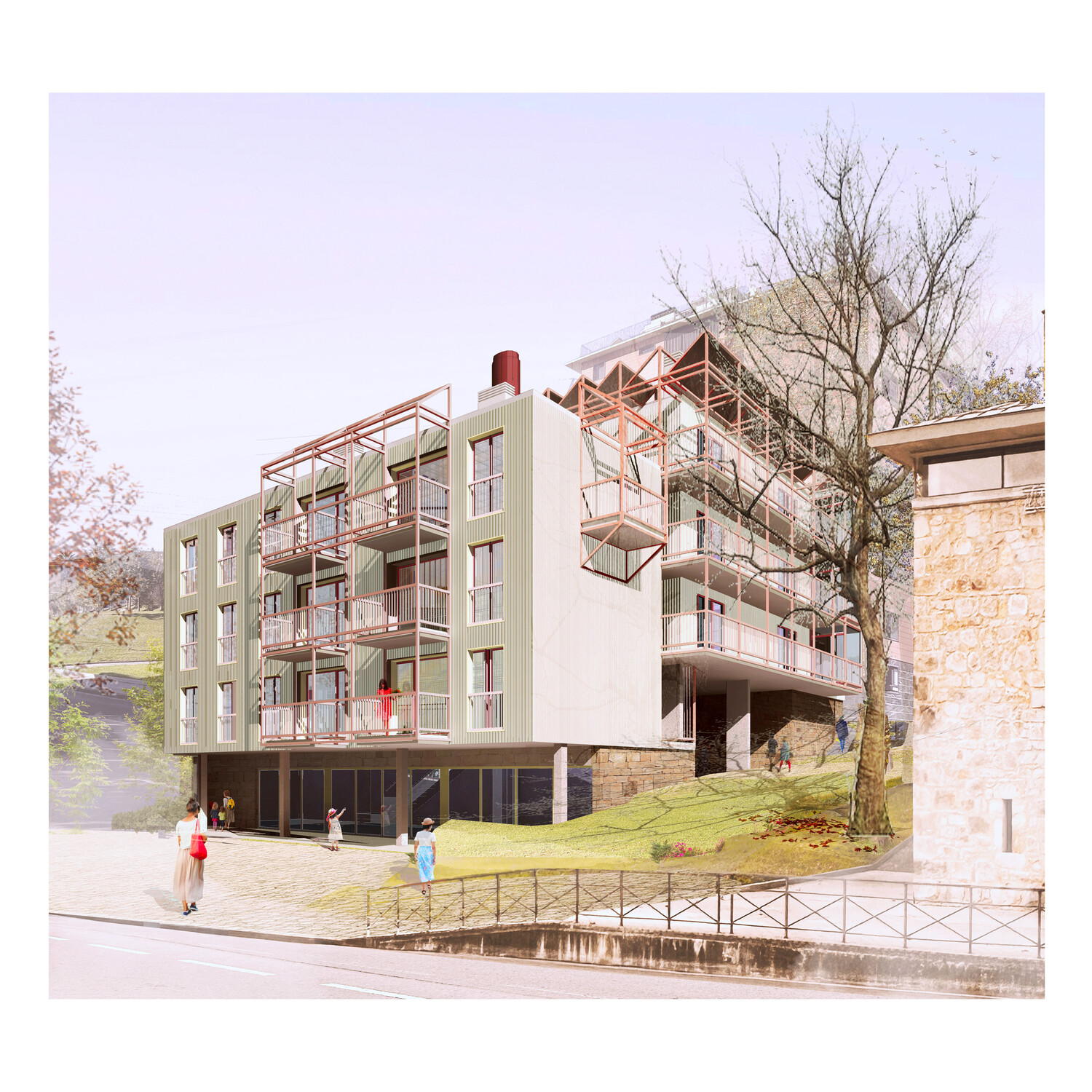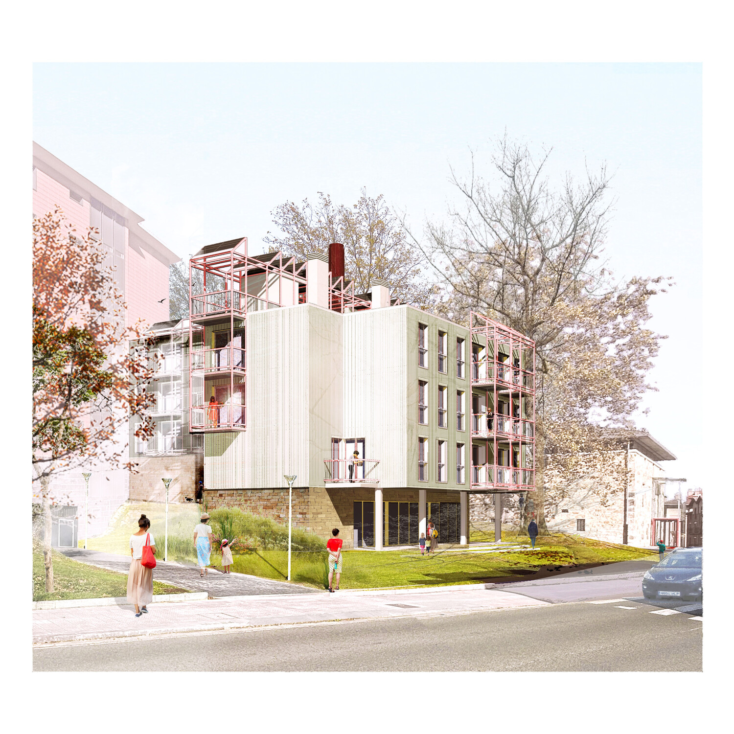 The program comprises eighteen public social housing units, employing a strong serial design strategy that manages the somewhat haphazard, irregular L-shaped geometry of the site. The choice of corridor access to the units aims to maximize the use of building space and resources. Given the building's small size, a single vertical core provides access to six units per floor, and open horizontal walkways allow access to all units along the L-shaped layout. This results in a space with minimal mechanical requirements and, consequently, low fixed maintenance costs (it does not require forced ventilation, artificial lighting is only needed at night…).