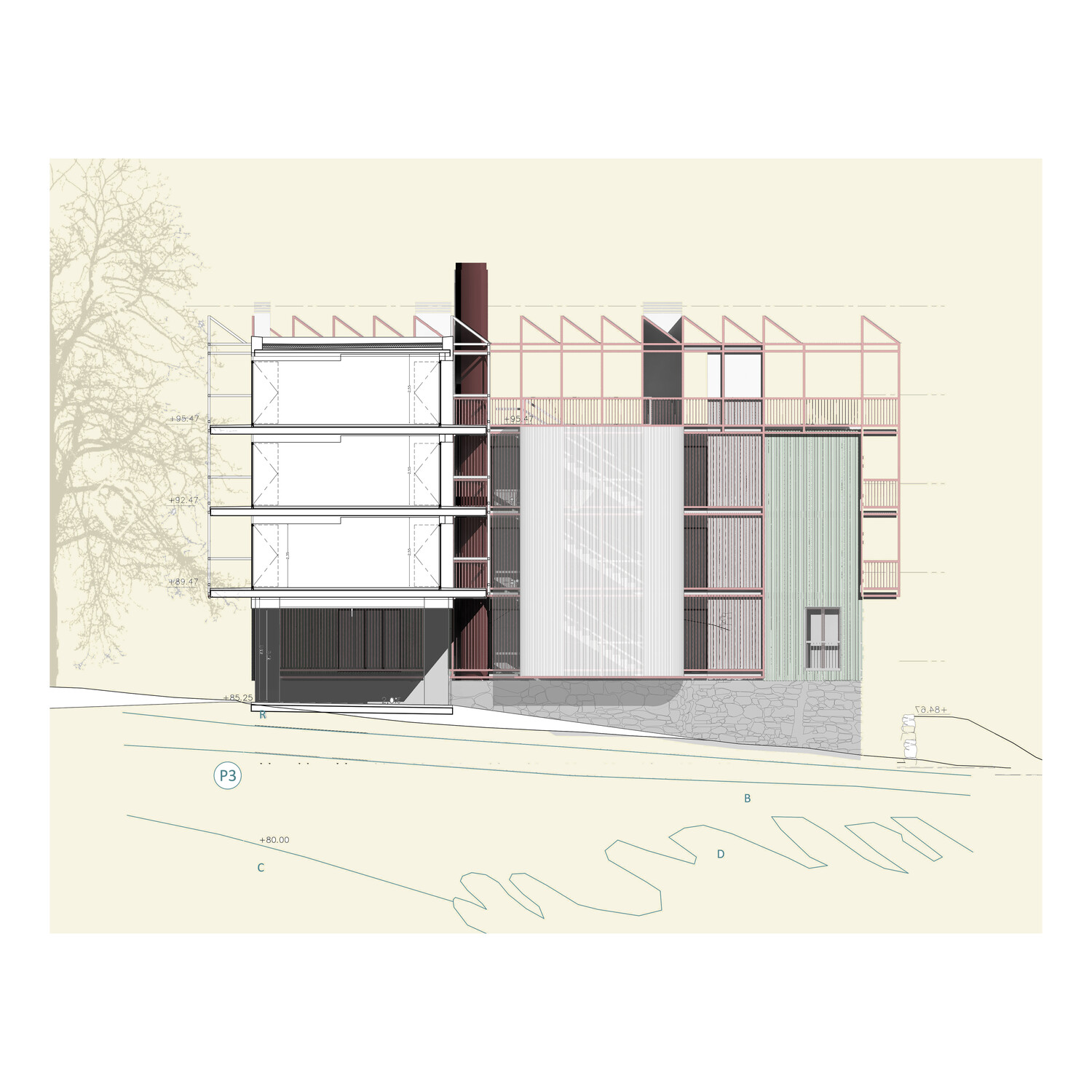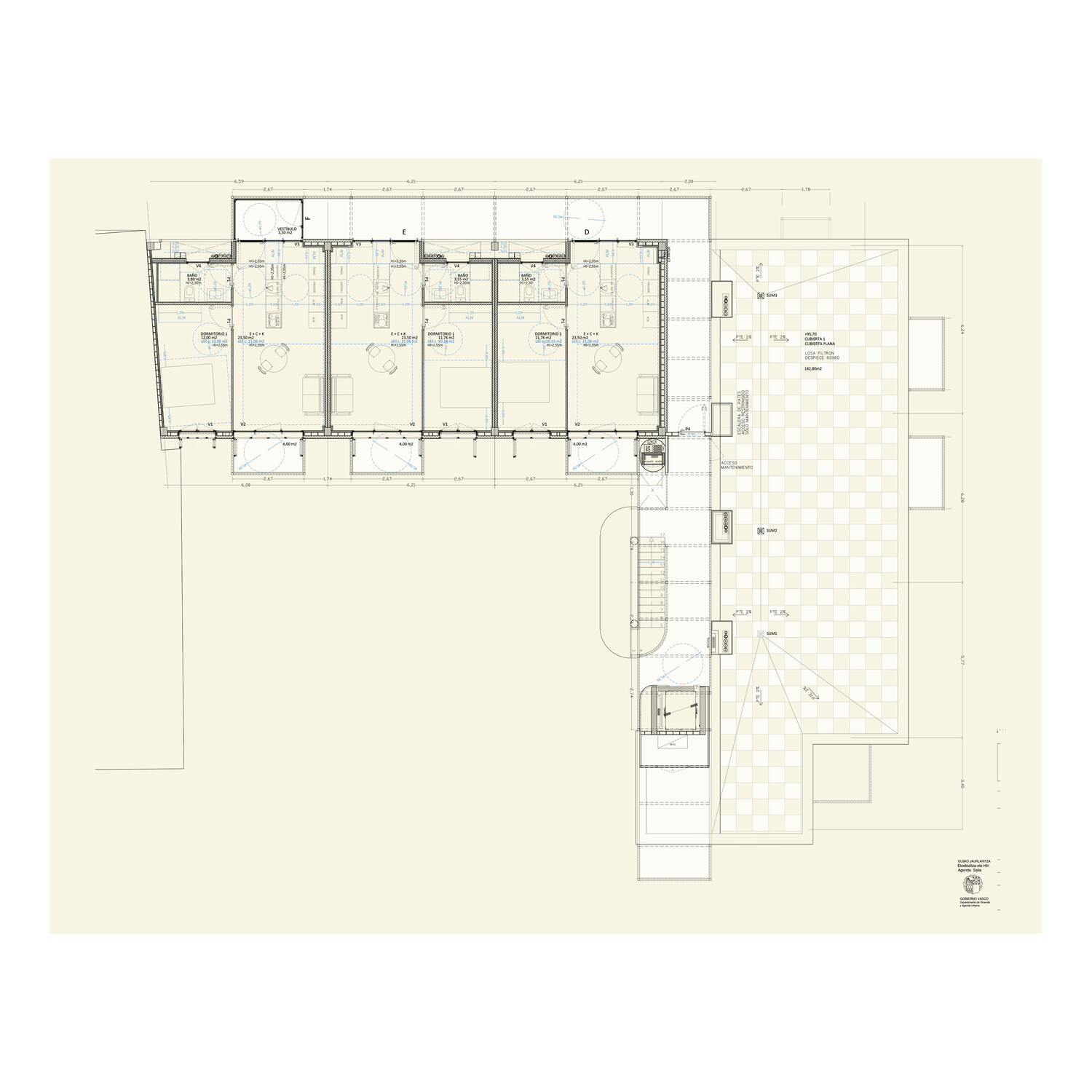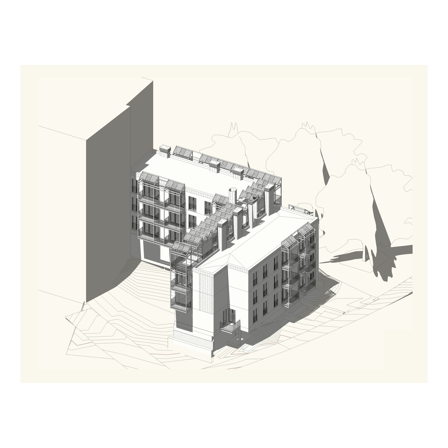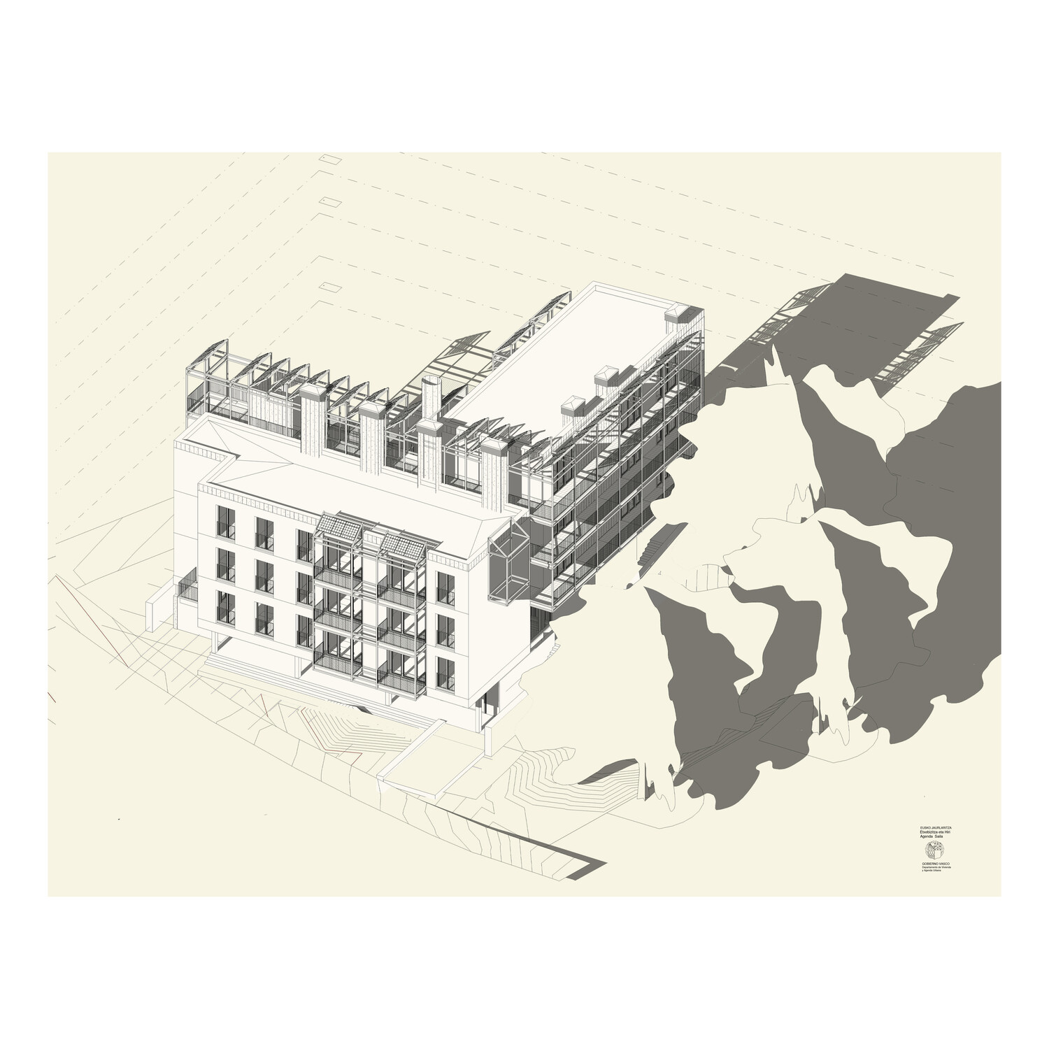 The program comprises eighteen public social housing units, employing a strong serial design strategy that manages the somewhat haphazard, irregular L-shaped geometry of the site. The choice of corridor access to the units aims to maximize the use of building space and resources. Given the building's small size, a single vertical core provides access to six units per floor, and open horizontal walkways allow access to all units along the L-shaped layout. This results in a space with minimal mechanical requirements and, consequently, low fixed maintenance costs (it does not require forced ventilation, artificial lighting is only needed at night…).