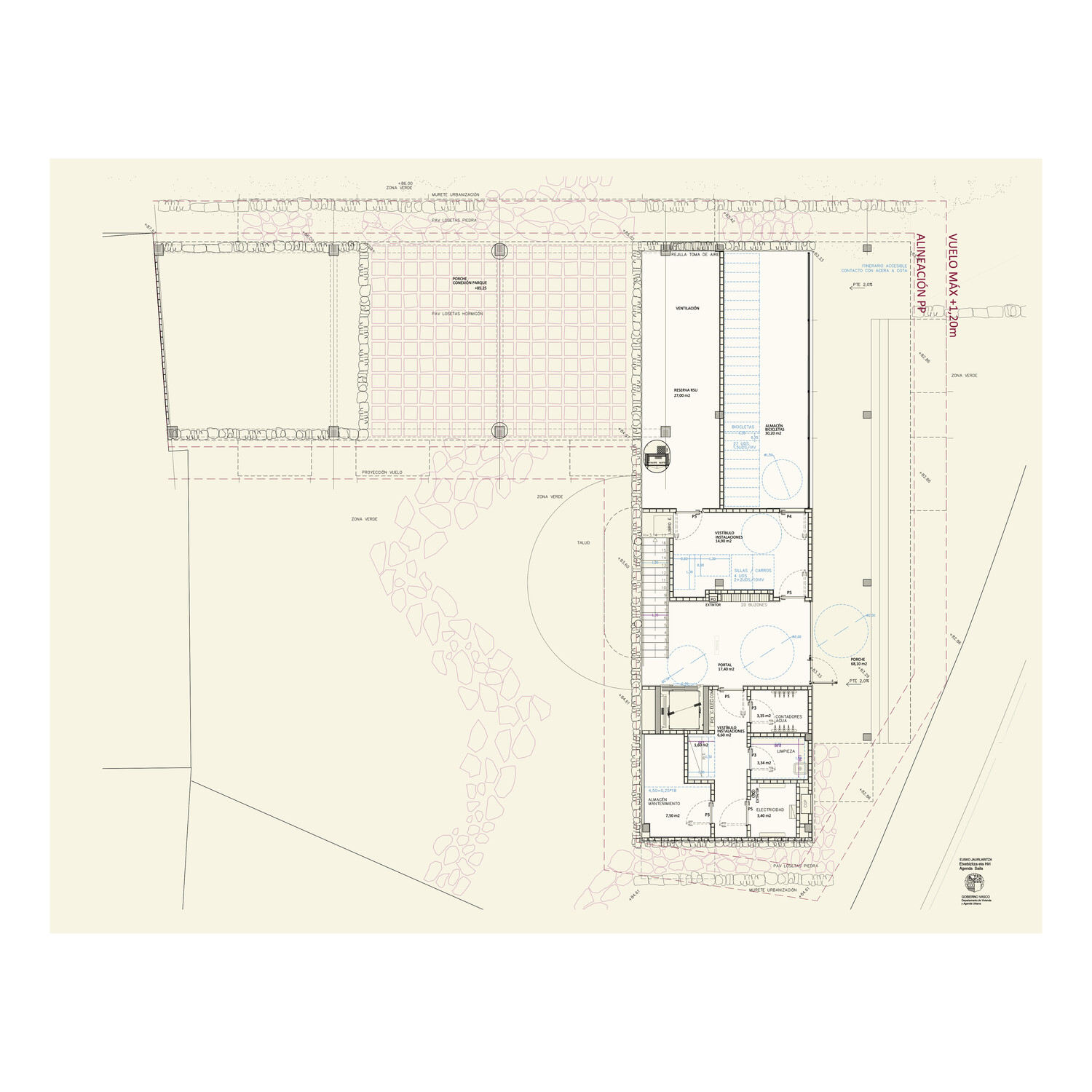 The building completes the last designated public plot in the southern part of the San Miguel area of Basauri. It's located on the edge of the municipality, a site where the urban fabric begins to thin out and revert to nature, moving away from the densely industrial urban sprawl of Greater Bilbao. The area has strong historical significance in Basauri, with the immediate presence of the Taberna Mayor manor house, the originally 18th-century town hall and now a cultural center. The neighborhood also features notable workers' housing complexes such as the La Unión de Elejalde group (1925) and the Hernán Cortés group (1955), and has experienced significant contemporary growth.