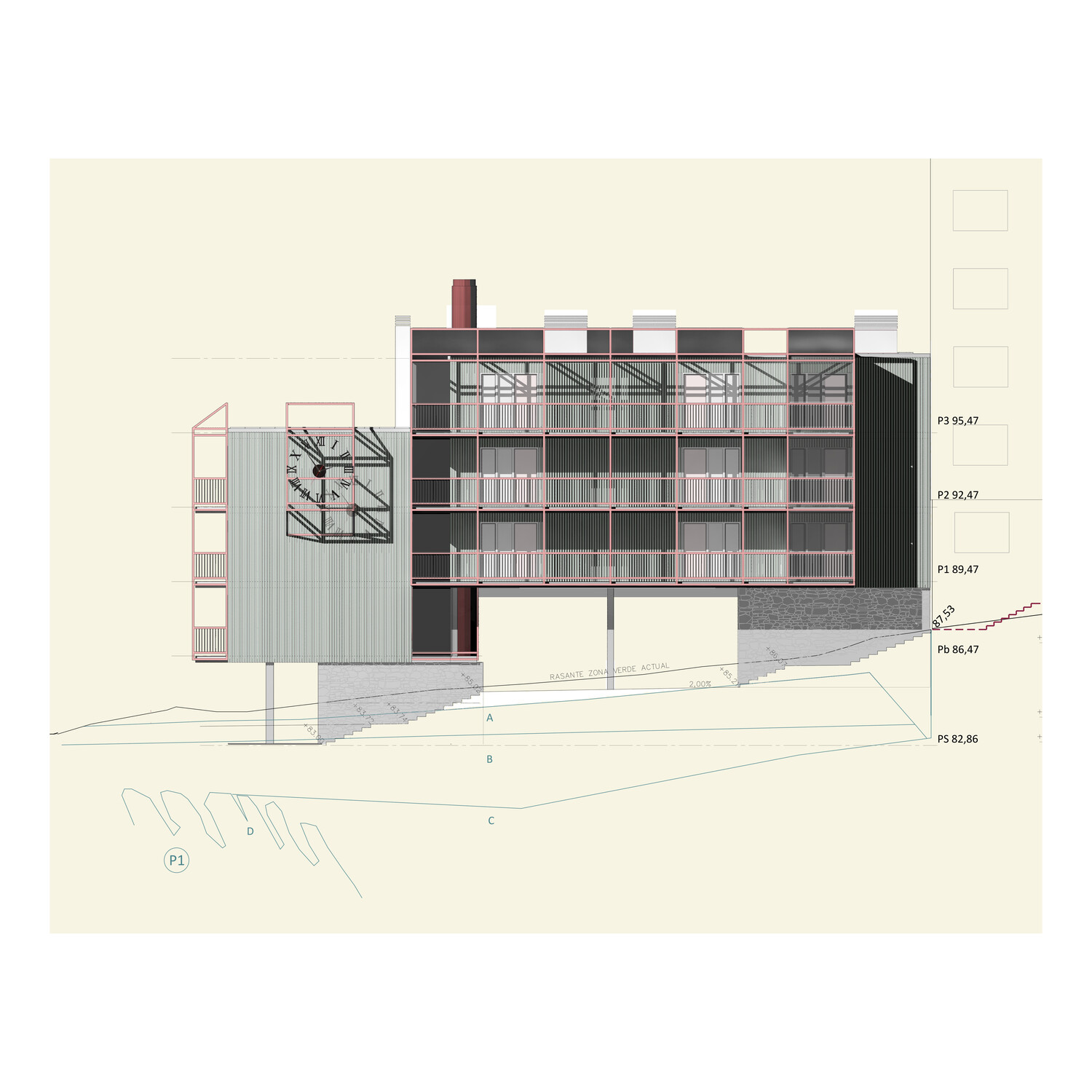 In this approach of compliance with minimums to social housing, each element contributes to the building's meaning. Thus, the composition of each functional element is integrated within the whole. The same ironwork that adorns the balconies, substructure and protective elements, extends to the roof, supporting the solar panels. The series of vertical openings and the stone plinth are a nod to Taberna Mayor. The volume of the staircase, attached externally to the access corridors, and the red chimney housing the main utility risers complete the entrance galleries.
